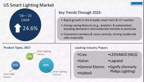 根据Freedonia Group的一份新报告,预计到2018年底,美国对智能照明的需求(包括光源,灯具和控制装置)将增加到9.45亿美元。市场研究公司表示预计到2025年,美国智能照明系统销售额达到44亿美元。